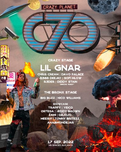 En la 070 tienen experiencia en habilitar distintos espacios para que no te aburras en ningún momento de la noche y puedas cambiar rápidamente de rollo/estilo. Esta vez, en el escenario Crazy Stage actuará Lil Gnar y contaremos también con la participación de Chris Cream, Davo Palace, 3/888 deejay, Sofi Mlow, R3der y Diddy Stain.