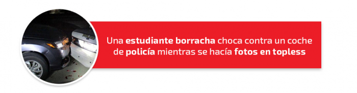 El titular lo dice todo. Miranda Kay Rader se lleva de calle el premio a la estudiante universitaria del año. La chica chocó su coche contra uno de policía mientras le mandaba fotos de sus pechos a su novio a través de Snapchat. Además, iba totalmente borracha sin apenas poder mantenerse en pie. Un cóctel- nunca mejor dicho- explosivo de hechos que hicieron que pasara la noche en comisaría y sus padres tuvieran que pagar 2.000 dólares de fianza.