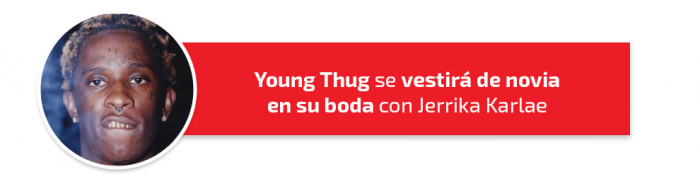 A Young Thug le da absolutamente igual lo que la gente piense de él, y lo demuestra con hechos como este. No sabemos si a modo de reivindicación o simplemente porque le apetecía, el de Atlanta declaró en una entrevista que en su boda con Jerrika Karlae él también llevaría vestido de novia. Una pena que todavía no hayamos podido ver a Thugga con ese vestido de novia al lado de su prometida.