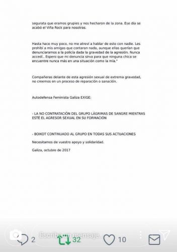 A través de este texto, la víctima describe el mal trago por el que habría pasado durante la celebración del festival Viña Rock 2017. Como podemos leer en el escrito, la joven acusa a uno de los miembros del colectivo catalán de haberla drogado con MDMA, y después haber intentado mantener relaciones sexuales con ella.