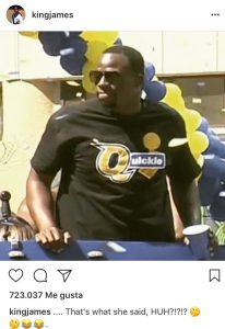 En la ya famosa camiseta de este año se puede leer “Quickle”, algo así como “rápido” o “fugaz”, el caso es que el jugador de los Cavs subió una foto en la que aparecía su rival luciéndola también en Instagram y dejó una descripción que ha hecho saltar a todos los fans como locos: “¿Eso fue lo que ella dijo?”