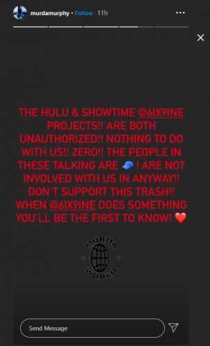 ¡Los proyectos de Hulu y Showtime están desautorizados! ¡Nada que ver con nosotros! ¡Cero! ¡Toda esa gente está mintiendo! ¡No están con nosotros! ¡No apoyéis esta basura! ¡Cuando 6ix9ine haga algo, seréis los primeros en saberlo!