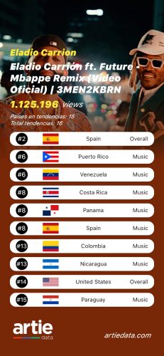 Desde el lanzamiento del LP, ‘Mbappe’ ha acumulado más de 55 millones de reproducciones en Spotify y más de 20 millones de views en YouTube. Sobre la pista, producida por Hydro y Bassy, escuchamos a Eladio Carrión compararse con el futbolista Kylian Mbappé, con el afamado streamer Ibai Llanos y con Blessd, estrella del reggaetón colombiano.