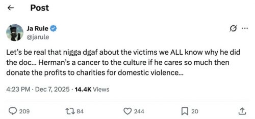 Esto es lo que acaba de decir el de Murder Inc. en Twitter al respecto de su némesis (aka 50), al que se refiere como Herman (en una mofa por el personaje de Herman Munster) a través de X :