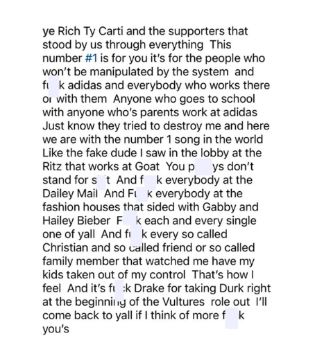 Rich, Ty, Carti y los que me han apoyado durante todo esto, este número uno es por ustedes. Esto es por la gente que es manipulada por el sistema. Y que se joda adidas y todos los que trabajan ahí o para ellos. Cualquiera que vaya a la escuela con algo de adidas o cuyos padres trabajen en adidas. Ellos sencillamente han intentado destruirme, pero aquí estamos con la canción número uno en el mundo. Así es como me siento y que se joda Drake por llevarse a Durk justo al principio de ‘Vultures’. Volveré con más «que os jodan» si creo que hay más «que os jodan»