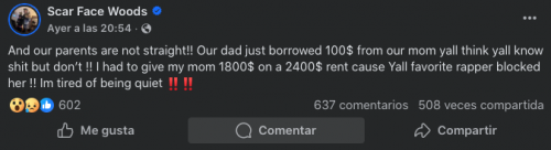 También afirmó que tanto su padre como su madre han estado pidiendo dinero prestado y que tienen la casa plagada de cucarachas, en un intento de demostrar que la rapera no ayuda a su familia.