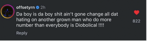 Obviamente, Offset hace referencia a que Drake sigue llenando estadios y batiendo récords en streamings. Aunque no lo menciona directamente, todo el mundo parece tener claro que Offset se refiere a las recientes críticas de T-Pain, que venía a decir que Drake debería haberse retirado ya disimuladamente.