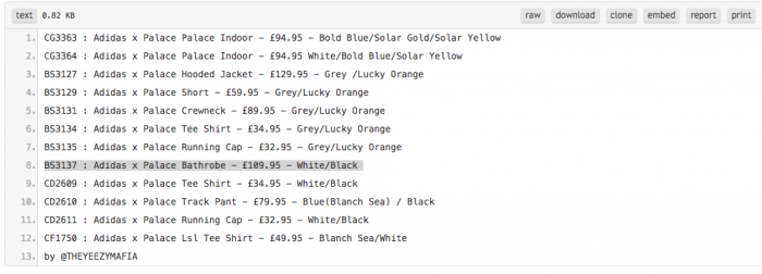 Por otra parte, la famosa cuenta de Twitter Yeezy Mafia ha sorprendido filtrando una imagen con los supuestos precios de todos los artículos de la colección. Si finalmente se corresponden con lo que marquen las etiquetas de las prendas una vez puestos a la venta para todo el público, nos encontraremos con un rango que irá de los 33€ de la gorra hasta los 109€ de la chaqueta con capucha.