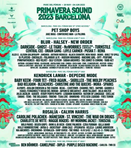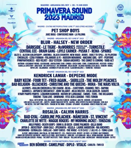 El Primavera Sound 2023 se celebrará en el Parc del Fòrum de Barcelona del 31 de mayo al 4 de junio y en Arganda del Rey en Madrid del 7 al 11 de junio. También coincidiendo con las fechas de la capital española tendrá lugar la edición de Porto en Parque Da Cidade.