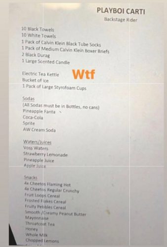 En este caso, la filtración ha sido la de Carti. Resulta que para antes de cada show, el de Atlanta ha de tener en su backstage cosas como un paquete de Calvin Klein, dos durags -típicos pañuelos de la cabeza que veíamos en los raperos americanos en los 2000-, varias bolsas de Cheetos, cereales e incluso un bote de mayonesa.