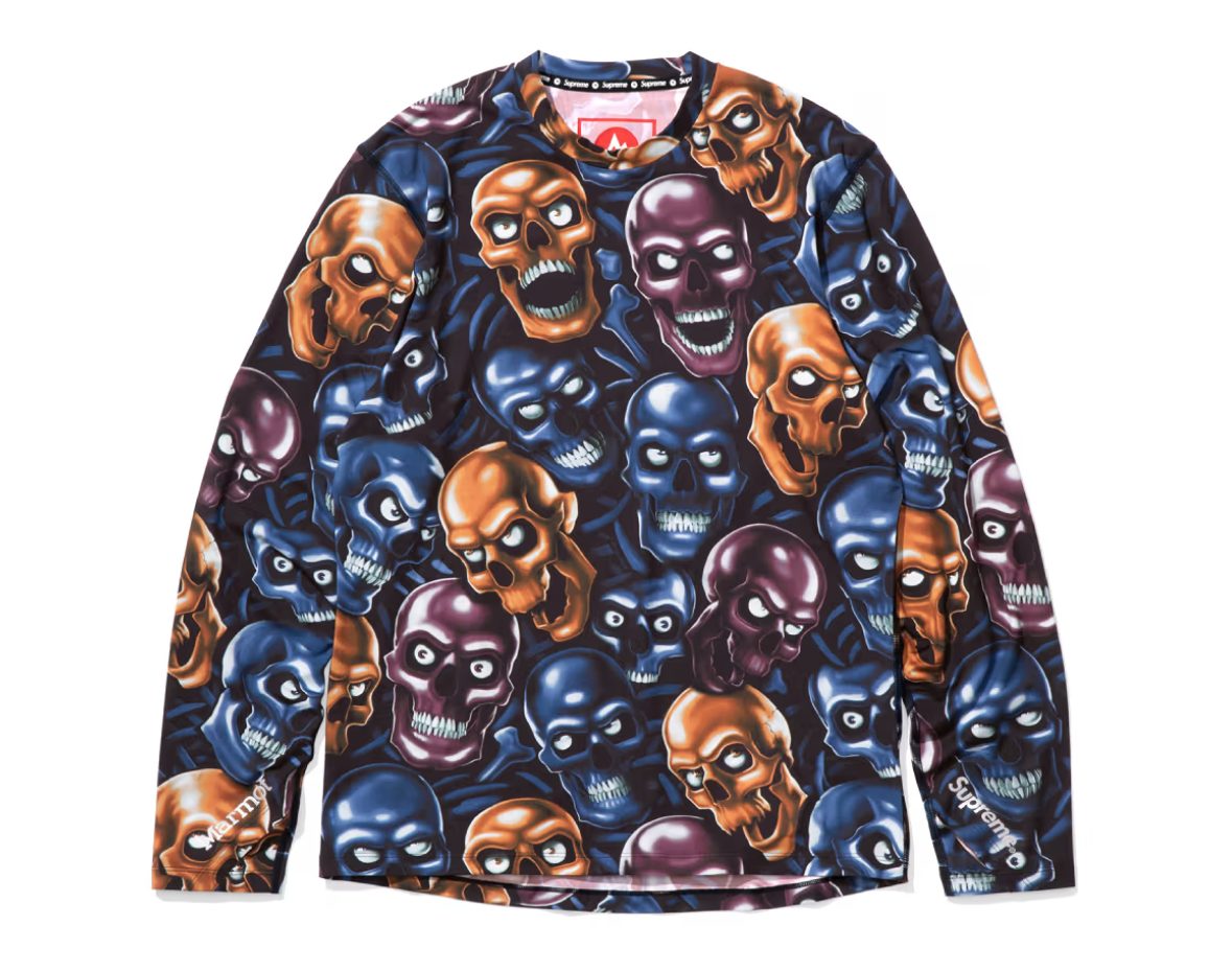 El elemento que lo une todo es un gráfico azul de calaveras apiladas con contrastes en naranja, fucsia, blanco y negro. Sin fallo, un rollito imaginario psicodélico que se aparta de lo aburrido, aunque no es la primera vez que Supreme recurre a este tipo de iconografía.